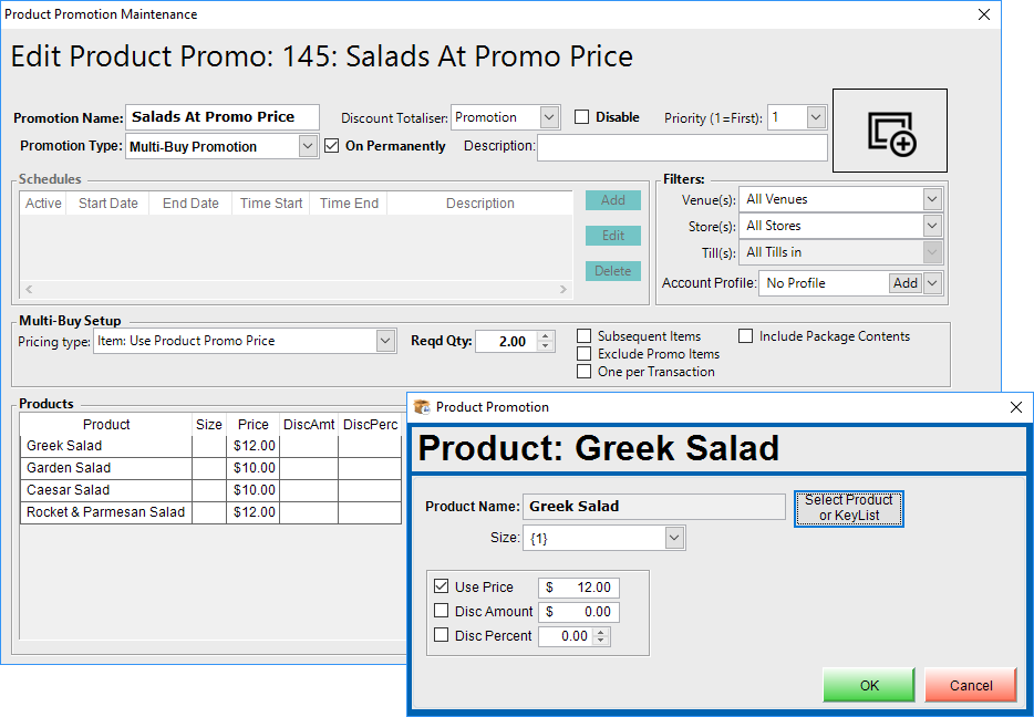 - E.g., purchase 2 salads to receive the configured Promotion Price for each; this Pricing Type allows for each applicable Product to have a different Promotion Price for each which is configured when the Product is added to the Promotion