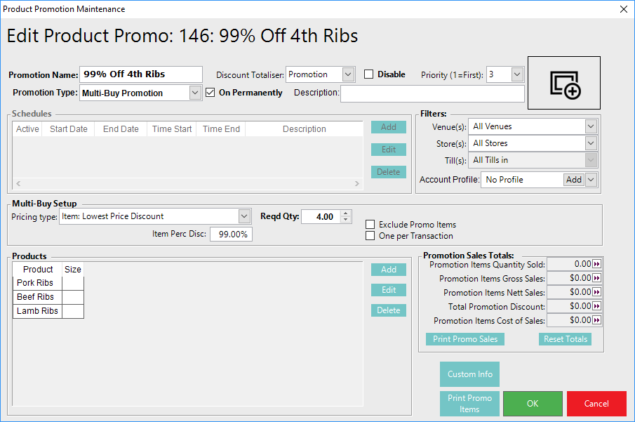 - E.g., purchase 4 racks of ribs to receive a 99% Discount on the Lowest-Priced