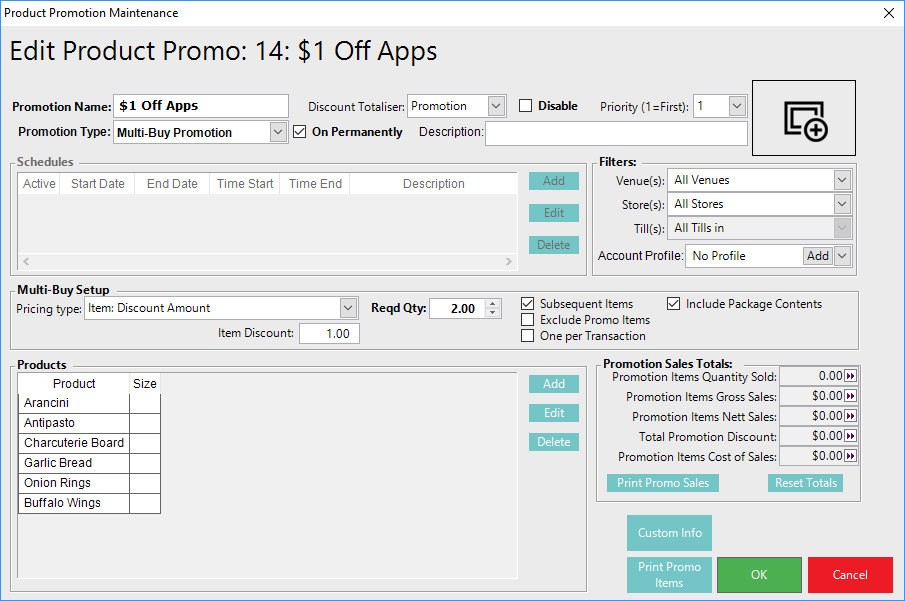 - E.g., purchase 2 or more Appetizers to receive a $1 Discount on each applicable Product