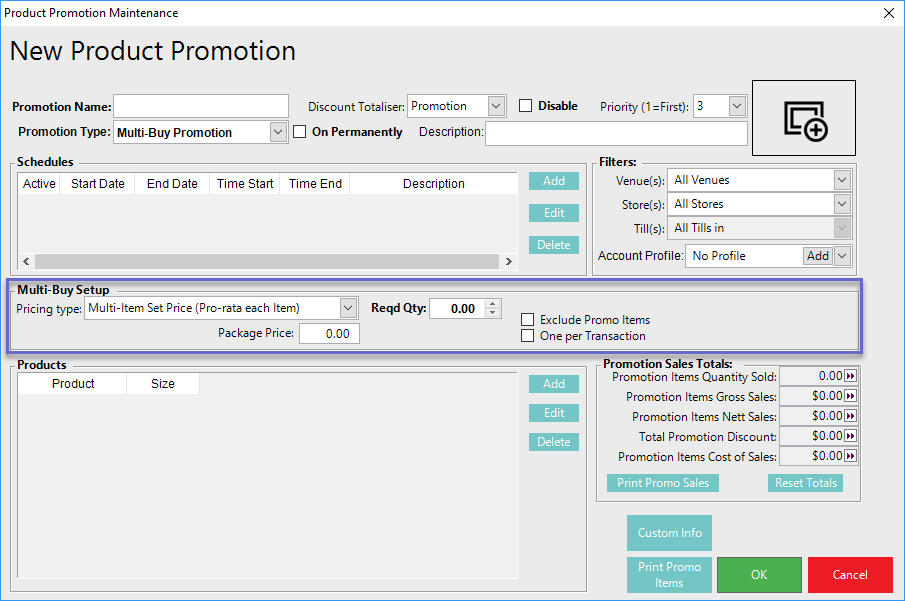 - After selecting 'Multi-Buy Promotion' as the Promotion Type, the Multi-Buy Setup section will appear dynamically in the Product Promotion Maintenance window