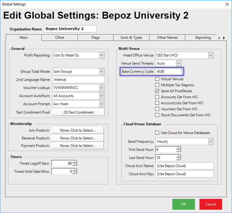 - For each Venue that uses a different Currency than the Organization's Base Currency that has been set in Global Settings, the Venue's Local Currency will need to be entered on the 'Main' Tab of Venue Maintenance