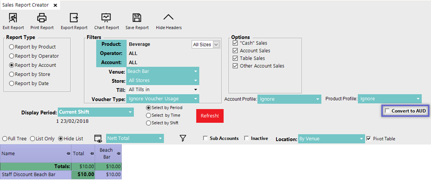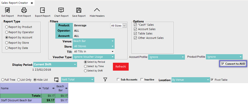 - When running a Report through Sales Report Creator for any Venue/s that use/s an alternate Local Currency to the Organization's Base Currency, the Convert to XXX flag can be used to toggle between viewing the data as the Venues' Local Currency or viewing as the Organization's Base Currency