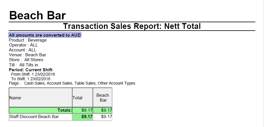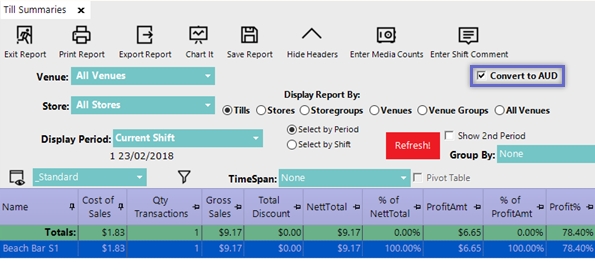 - When running a Till Summaries Report for any Venue/s that use/s an alternate Local Currency to the Organization's Base Currency, the Convert to XXX flag can be used to toggle between viewing the data as the Venues' Local Currency or viewing as the Organization's Base Currency