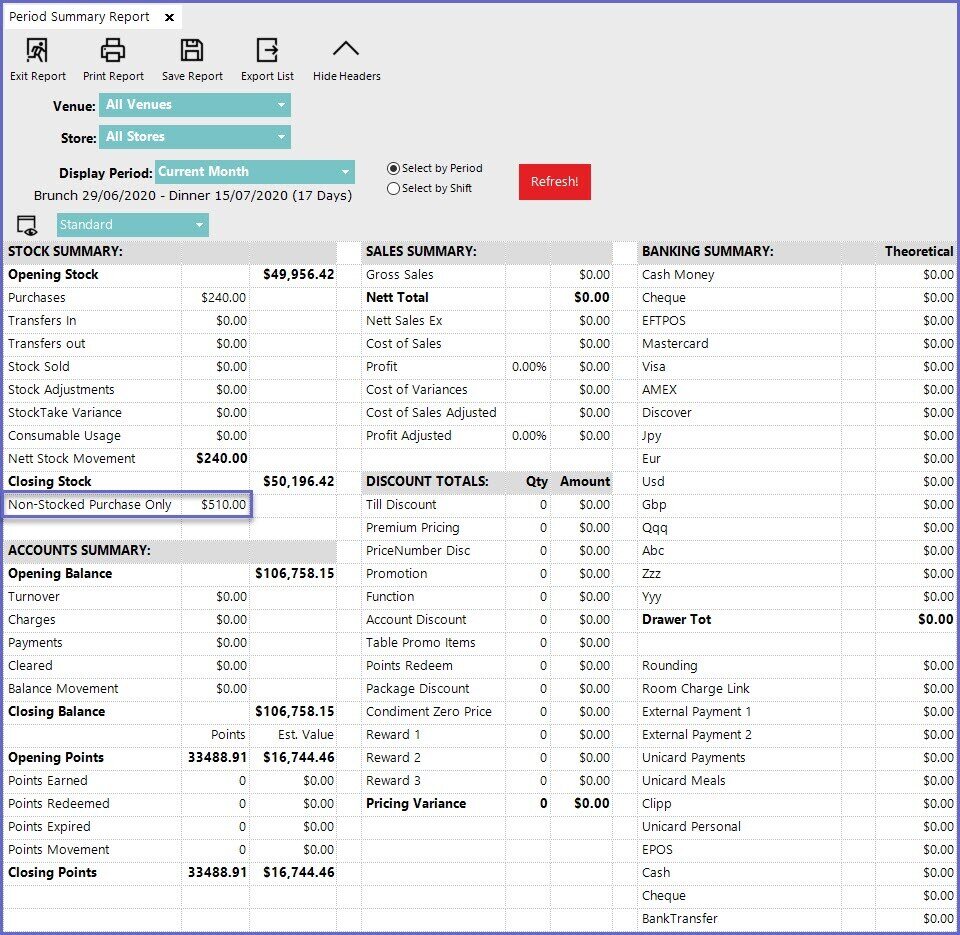 - The Products that use the Non-Stocked Purchase Only Stock Mode, when Purchased, will appear on the Period Summary Report as a monetary total