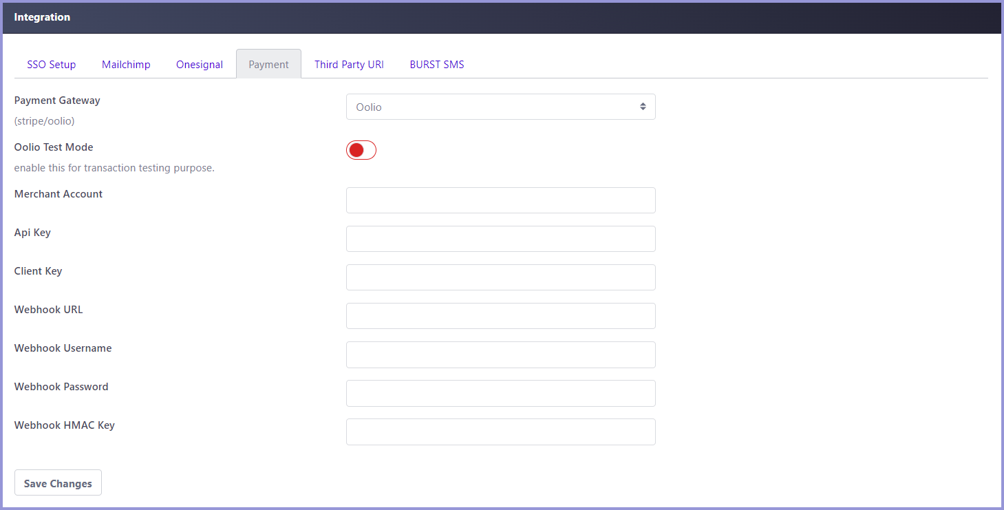 Oolio Test Mode: A toggle to switch between test and live Oolio accounts.
