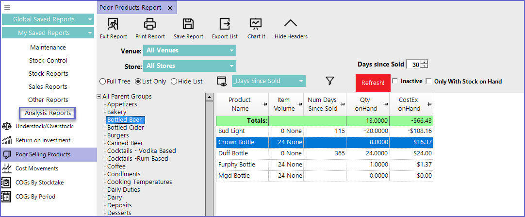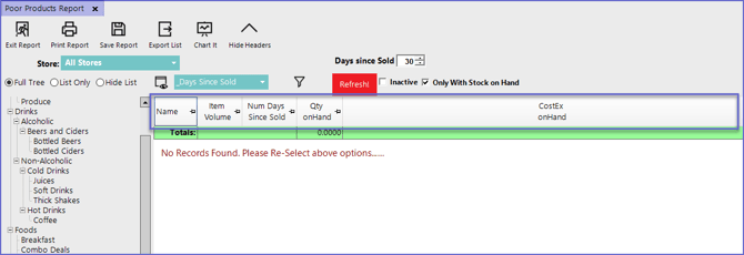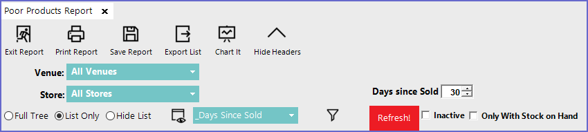 • The Days Since Sold View of the Poor Selling Products Report includes the following data columns by default: