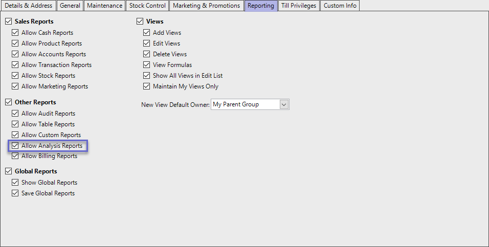• For an Operator to be able to access and run an Analysis Report within BackOffice, the Allow Analysis Reports flag within the  Reporting tab of Operator Maintenance  must first be enabled