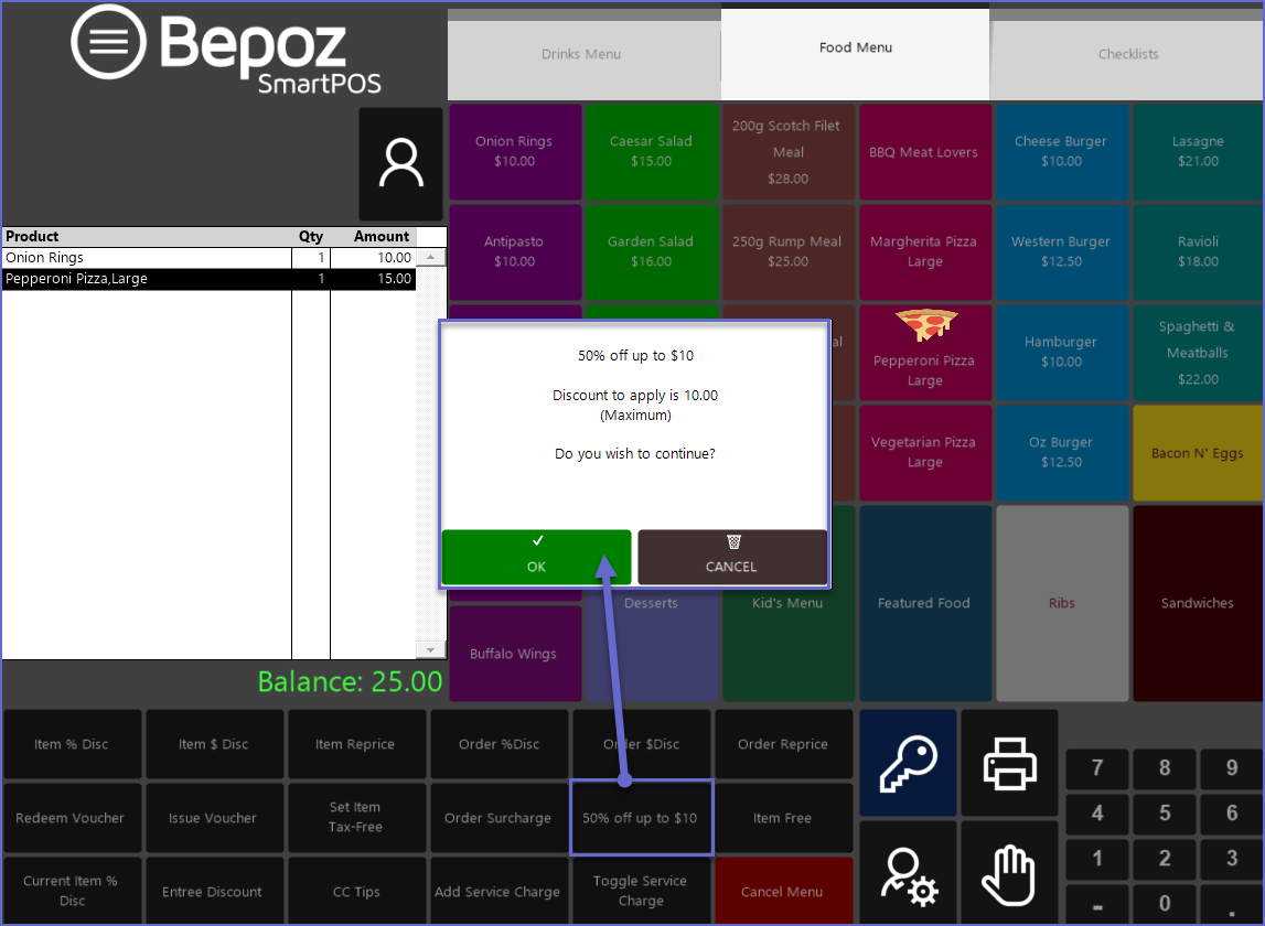 • Upon tapping the desired Preset Discount button, there may be a prompt informing the Operator how much the Discount will be such as in the below example