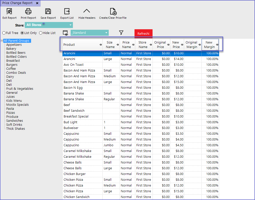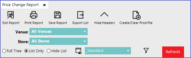 - The Standard View of the Price Change Report consists of the following data columns by default: