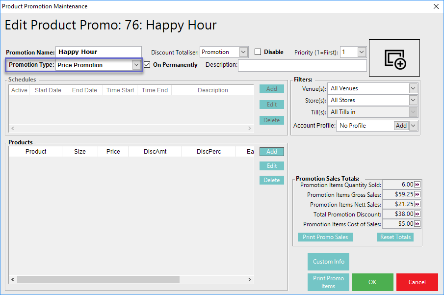 - After opening a new Product Promotion Maintenance window, select 'Price Promotion' as the Promotion Type from the drop-down