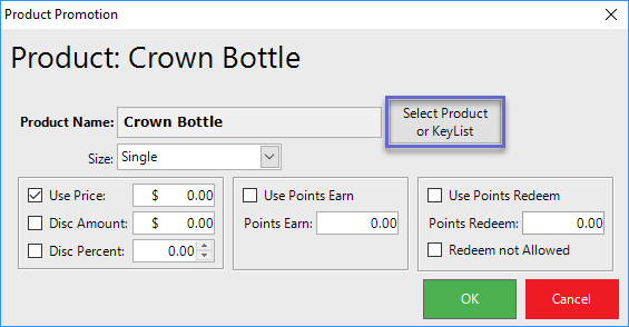 - After the selection, a small window will appear where additional details for the Product as it relates to the Promotion can be configured