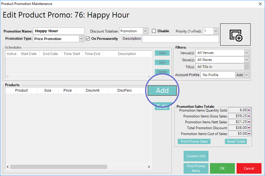 - To Add a New Product, Product Group, Keylist, Sort, Type, SortGroup, Type Group, or All Products to a Price Promotion, click on the 'Add' button in the Products Section