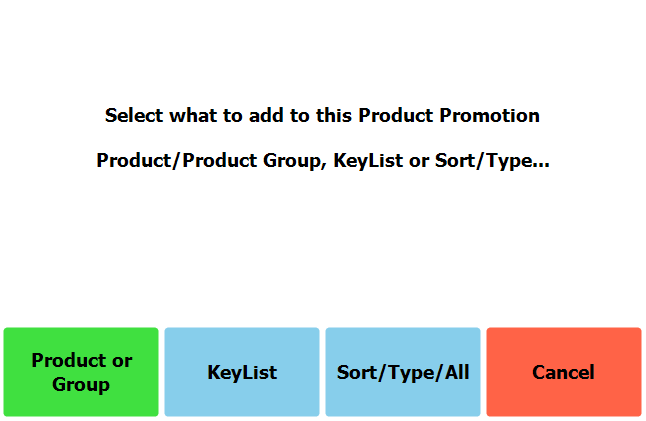- A similar screen to below will appear with options for adding a Product or Product Group, a KeyList , or a Sort, Type, or All Products