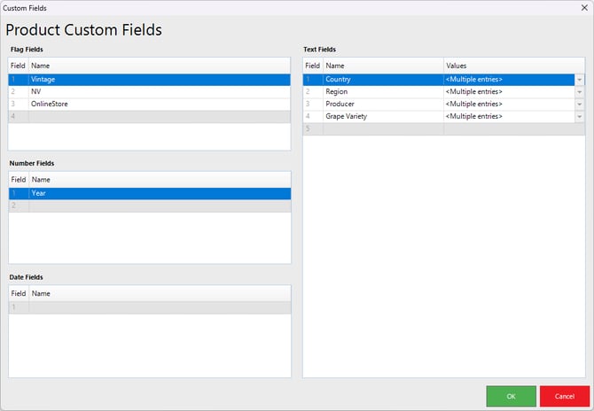 Image below shows the Product Custom Fields window following customisation of some fields.