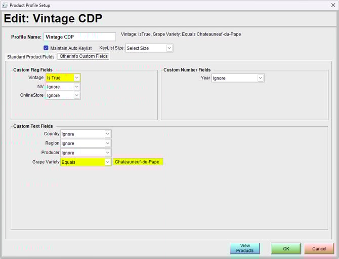 When configuring a Product Profile, select the Other/Info Custom Fields tab to apply Custom Info conditions.