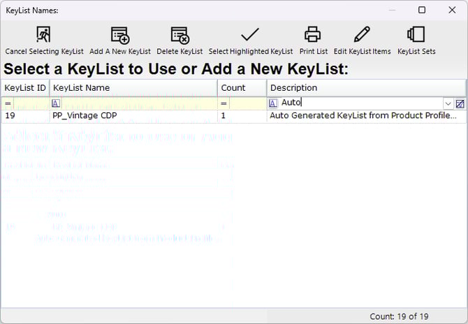 Once a Product Profile has been created and Maintain Auto Keylist is enabled, the generated KeyList can be viewed from the KeyList selection window.