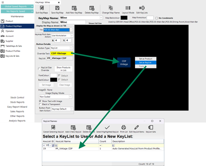 Image below shows adding a POS button (Set as KeyList) to a KeyMap in BackOffice.