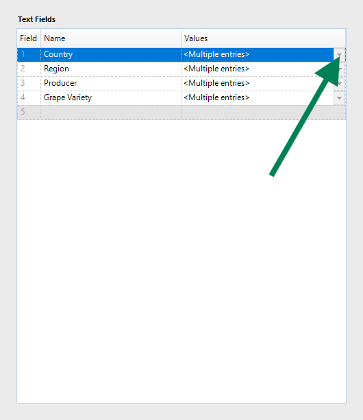 In the Product Custom Fields window, the Values column may show <Multiple entries> when more than one value has been configured for a Text Field.