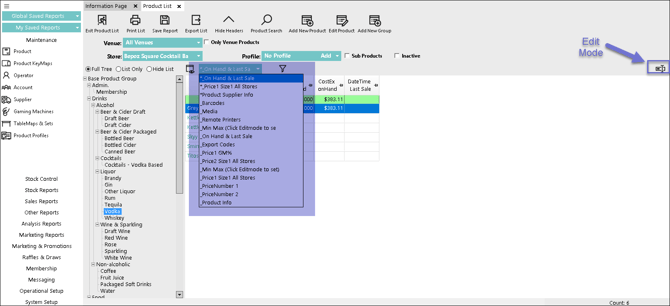Each View will produce different Product information, some of which is Editable, to Edit, click the Edit Mode button on the far right.