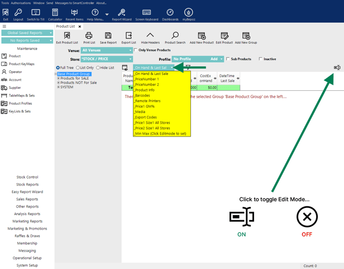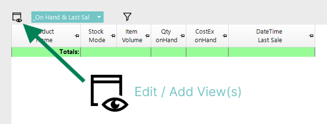 Standard Product List Views can be edited by opening the View Editor using the icon shown in the image. Standard views are identified by an underscore at the beginning of the view name, for example, _On Hand & Last Sale.