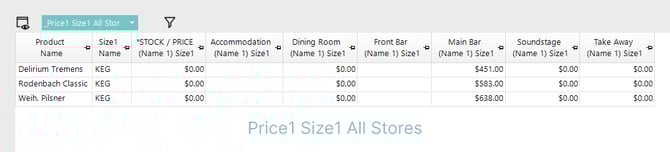 - Selling price of Price Number 1, Size 1 for all Stores available to the Operator