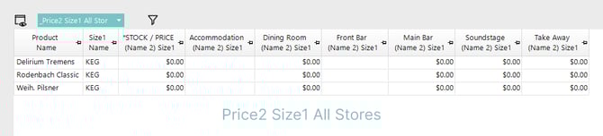 - Selling price of Price Number 2, Size 1 for all Stores available to the Operator