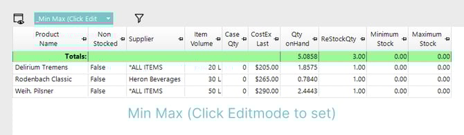 ✏️ Product Name, Case Qty, ReStock Qty, Minimum Stock, and Maximum Stock are editable.