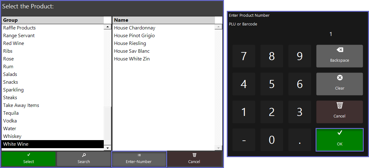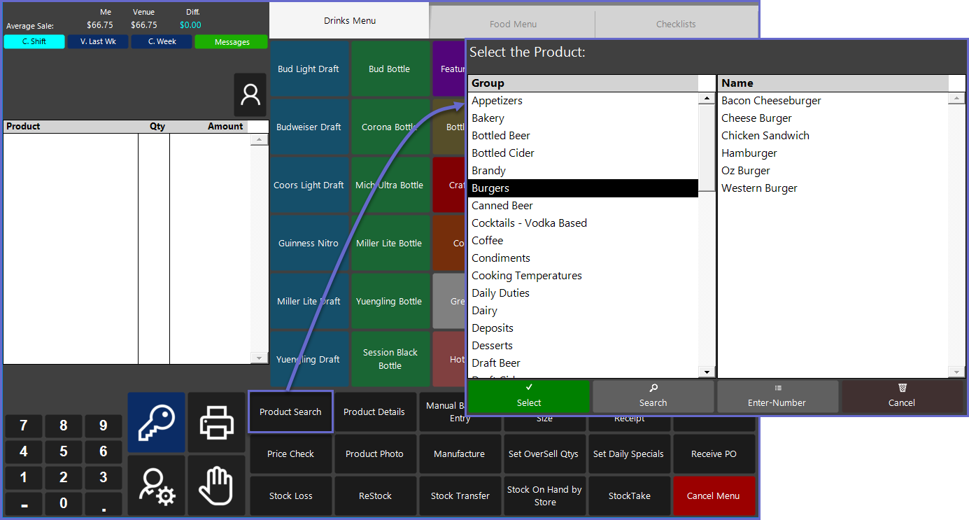 The Product Search Function will allow Operators to search for a Product in the system. Products will be listed by their Group allowing the Operator to navigate through to locate the desired Product. An Operator can also search by Name or by entering a PLU or Barcode Number.