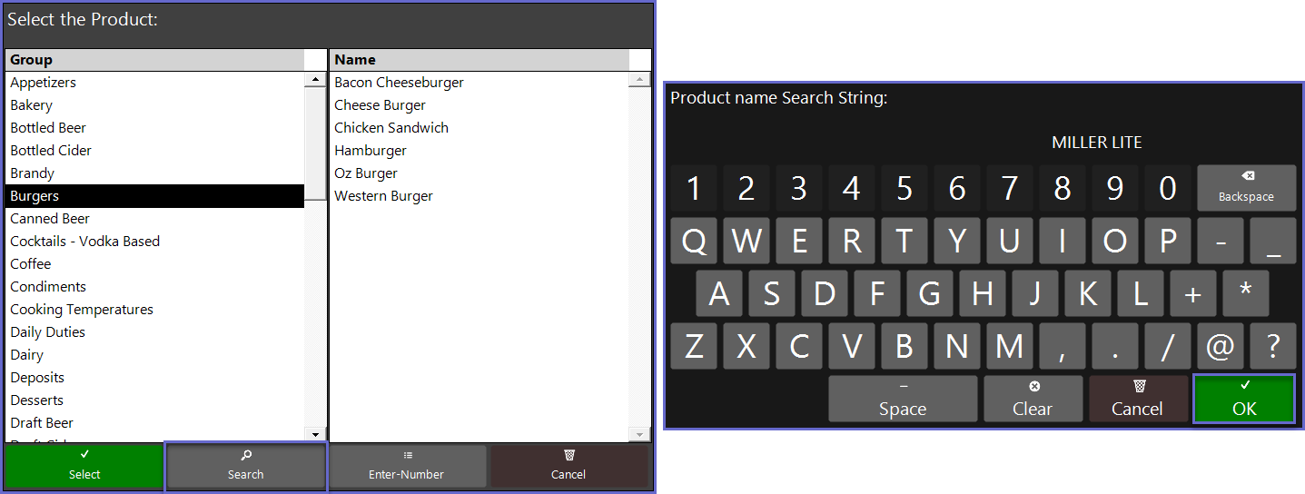 - This will open a window displaying an alphanumeric keyboard allowing the Operator to enter the Name of a desired Product or part of a Product Name