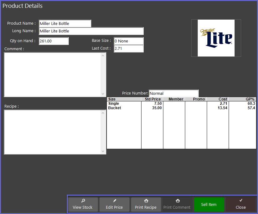 When a Product has been selected, a Product Details window will open. From this window, the Operator can select to sell the Product and add it to the current Transaction.