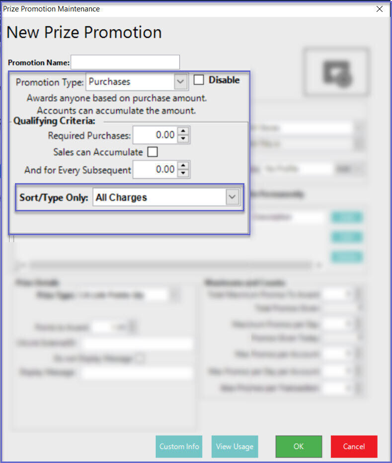 The Promotion Type drop-down lists several options that can be chosen when configuring a Prize Promotion and each Promotion Type has different Qualifying Criteria that must be met in order for the Prize to be Awarded.