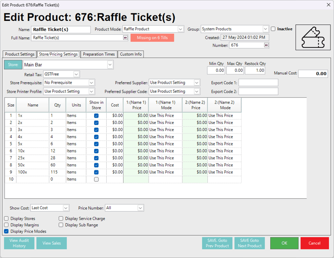A raffle product is set as Non-Stocked because raffle tickets are generated and sold through the system - they do not decrement from any stock on hand levels.