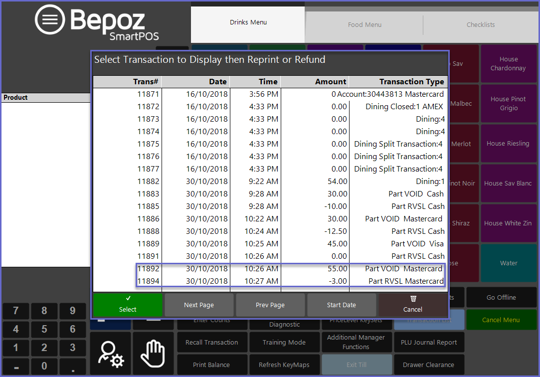 Once Recalled, Transactions can be Reprinted and Refunds can be processed. If the desired Transaction was from a previous date, the Operator can select a past Start Date to view Transactions from.