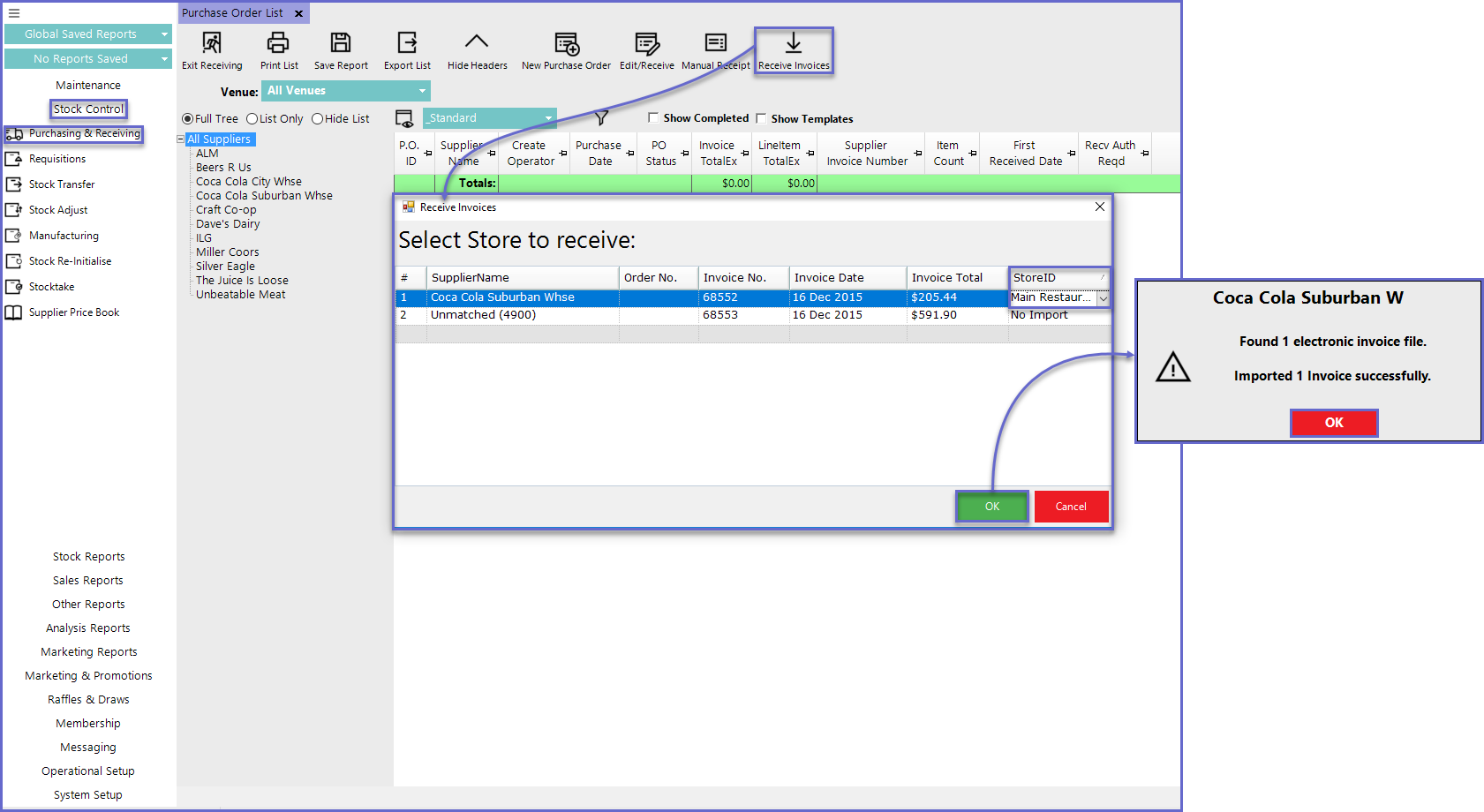 4. Select the desired Invoice that will be Imported and also the Venue that will receive the Stock