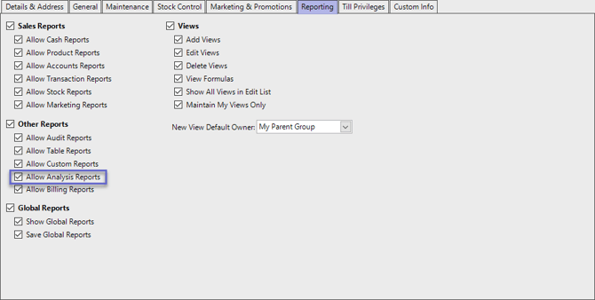 - For an Operator to be able to access and run an Analysis Report within BackOffice, the Allow Analysis Reports flag within the Reporting tab of Operator Maintenance must first be enabled