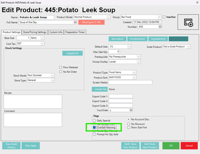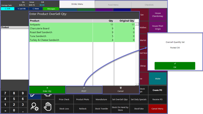 - Products that are set up/classified as a Stocked Product may also have the Oversell Warning flag turned on, and when used in conjunction with the Stock Control module of Bepoz, will show the Quantity on Hand number based off the actual Stock on Hand for that Store from BackOffice