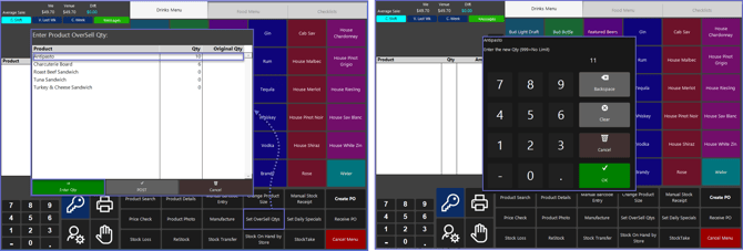 The Set Oversell Quantity Till Function can be used by an Operator to enter the remaining Quantity of Products (Non-Stocked) that are available to be sold - the Quantity on Hand (QOH). After an Oversell Quantity has been entered, warning prompts will appear as the entered QOH reaches zero.