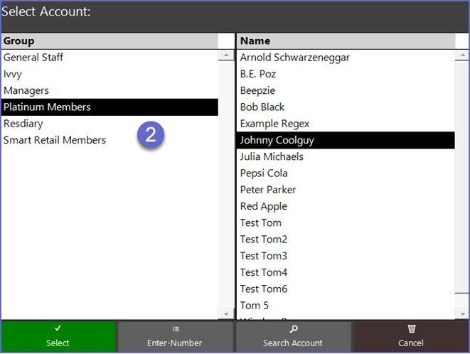 2. This will open a window prompting the Operator to select the desired Account; the Operator can navigate through the Account Group List, enter the Account Number, or search for an Account