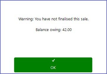 • A warning prompt will display informing the Operator that the Transaction has not been finalized; tap OK to continue
