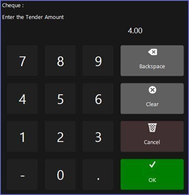 • The Cheque Tendered Amount will display in the Transaction Window