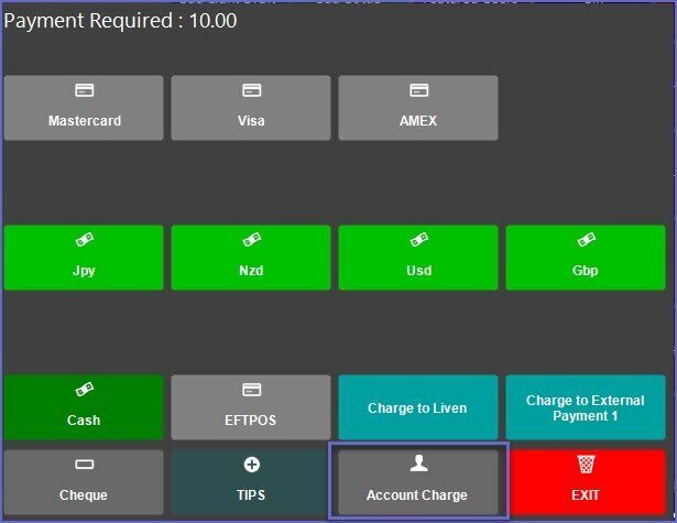 • These options include common Credit Card Types, Cash, Debit/EFTPOS, Check, and Account Charges