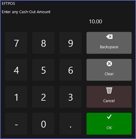 • If configured, after tapping the EFTPOS Key, a prompt will appear offering for an optional Cash-Out Amount to be entered