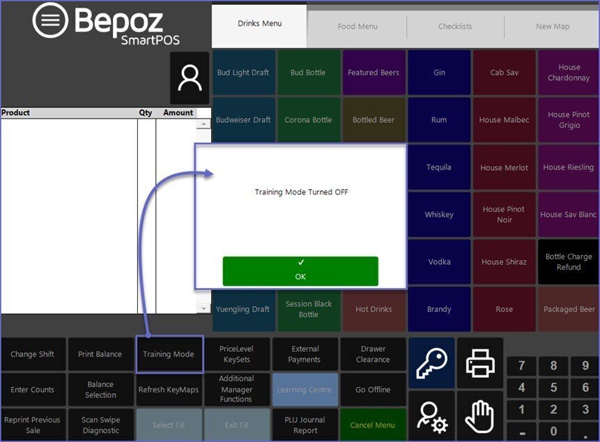 After an Operator has Logged On to a SmartPOS Workstation, Training Mode can be enabled to allow for SmartPOS Training. This can be a useful tool for Training New Operators or for Testing purposes.