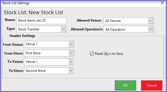 - ResetQTYZero: If this is ticked, the qty’s specified from the template will change to zero (0) when the Stock List is used