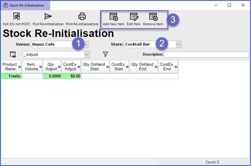 - Before adding items to the Re-Initialisation select a Venue and Store