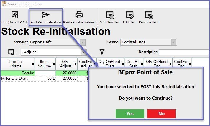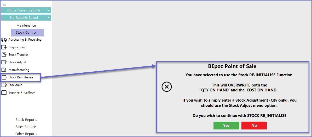 - Select Stock Re-Initialise; a prompt will appear which will need to be addressed prior to proceeding