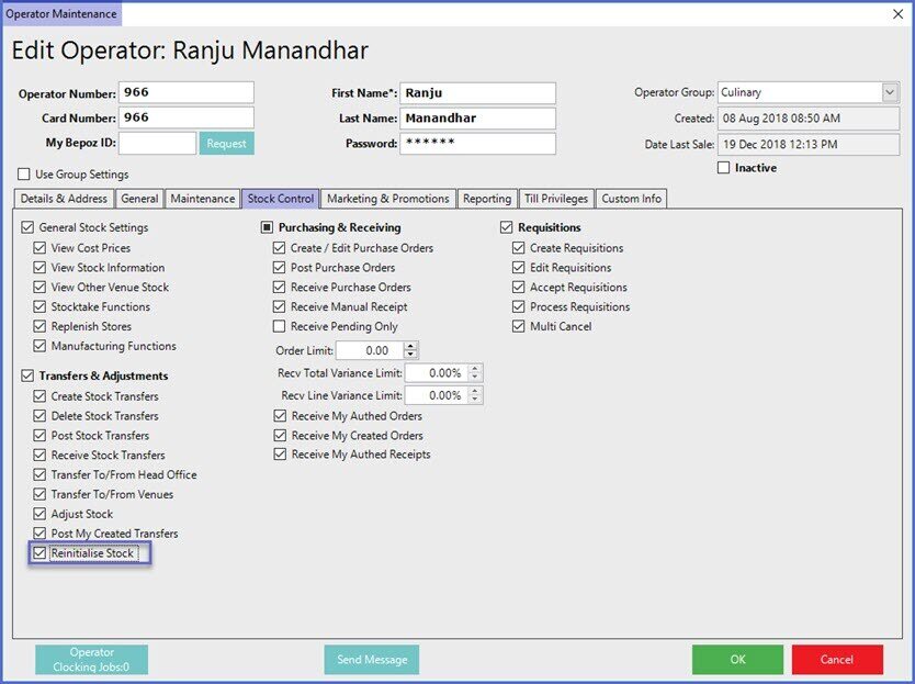 - For an Operator to have access to perform Stock Re-Initialisations, the Reinitialise Stock flag within the Stock Control tab of Operator Maintenance must first be enabled