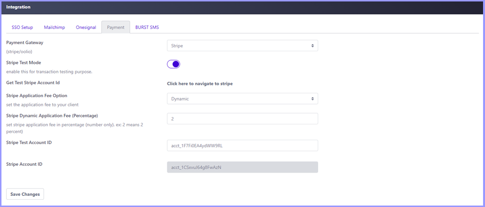 Stripe Test Account ID: Input the test account ID. This account will be used when Stripe is set to test mode