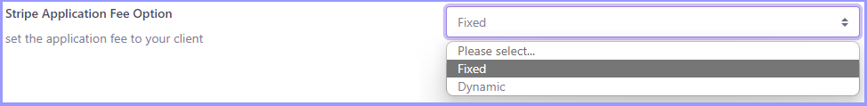 Stripe Application Fee Option: A dropdown that allows users to choose an application fee type, Dynamic (percentage) or Fixed (Cents)