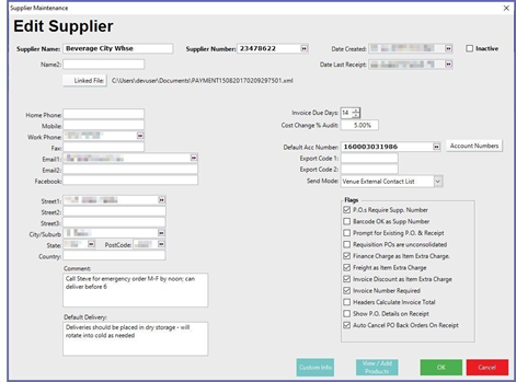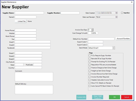 After opening a Supplier Maintenance window, whether to Edit an existing Supplier or to Add a New Supplier, there will be a plethora of fields and configuration options which are detailed in this article.